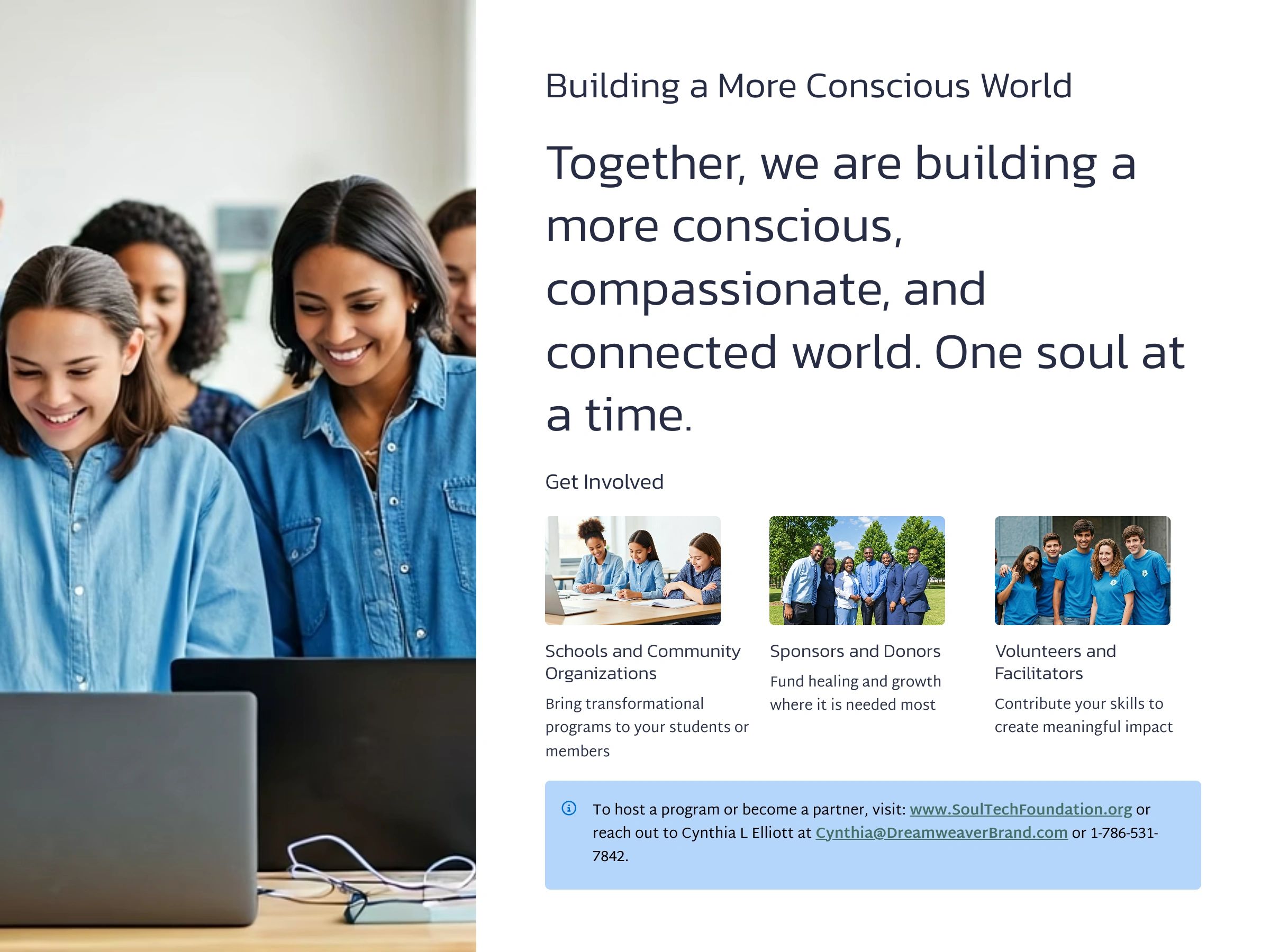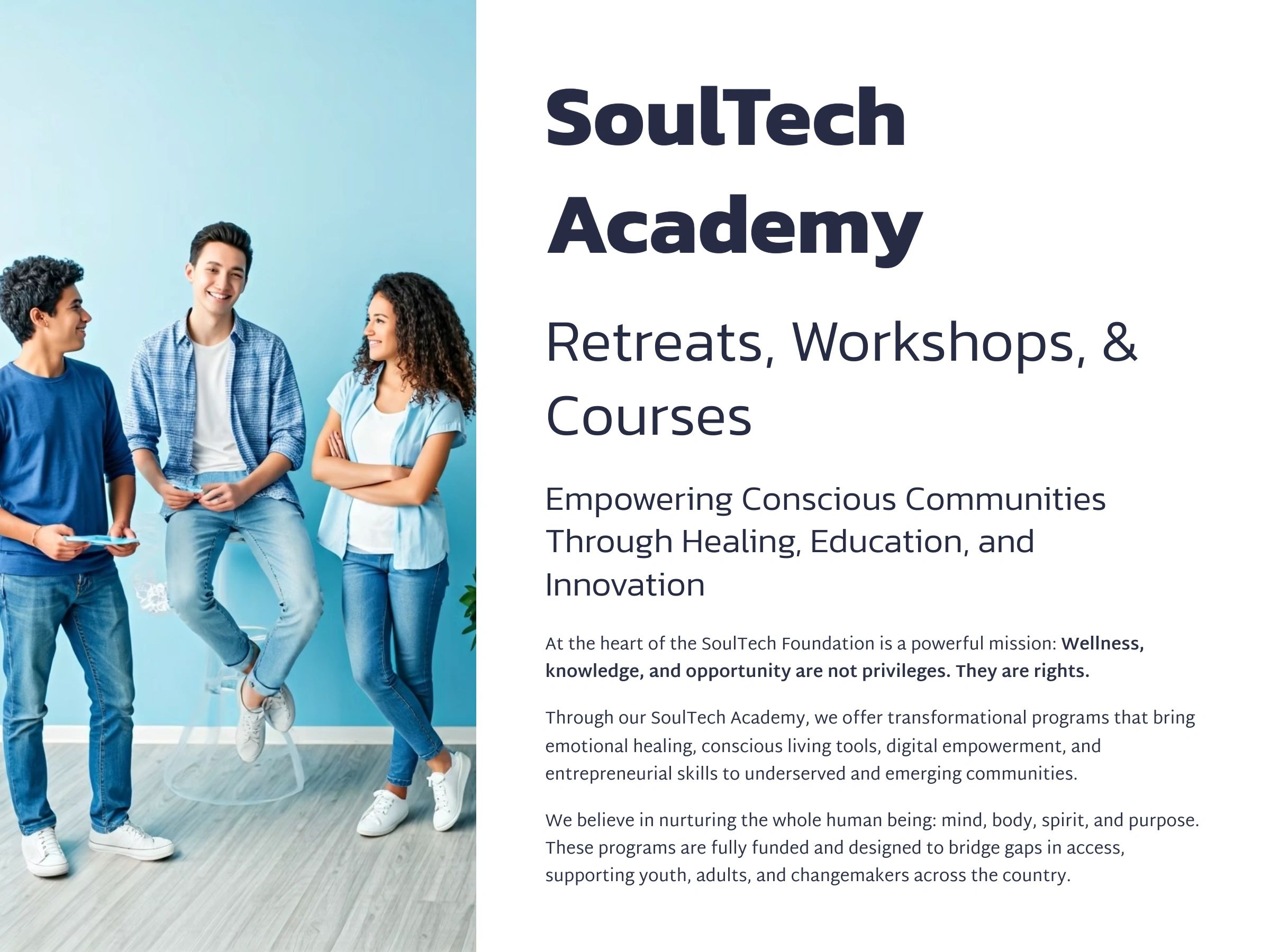 When you support SoulTech, you help create a legacy of conscious living and leadership. Your partnership brings essential tools and opportunities to the communities that need them most.