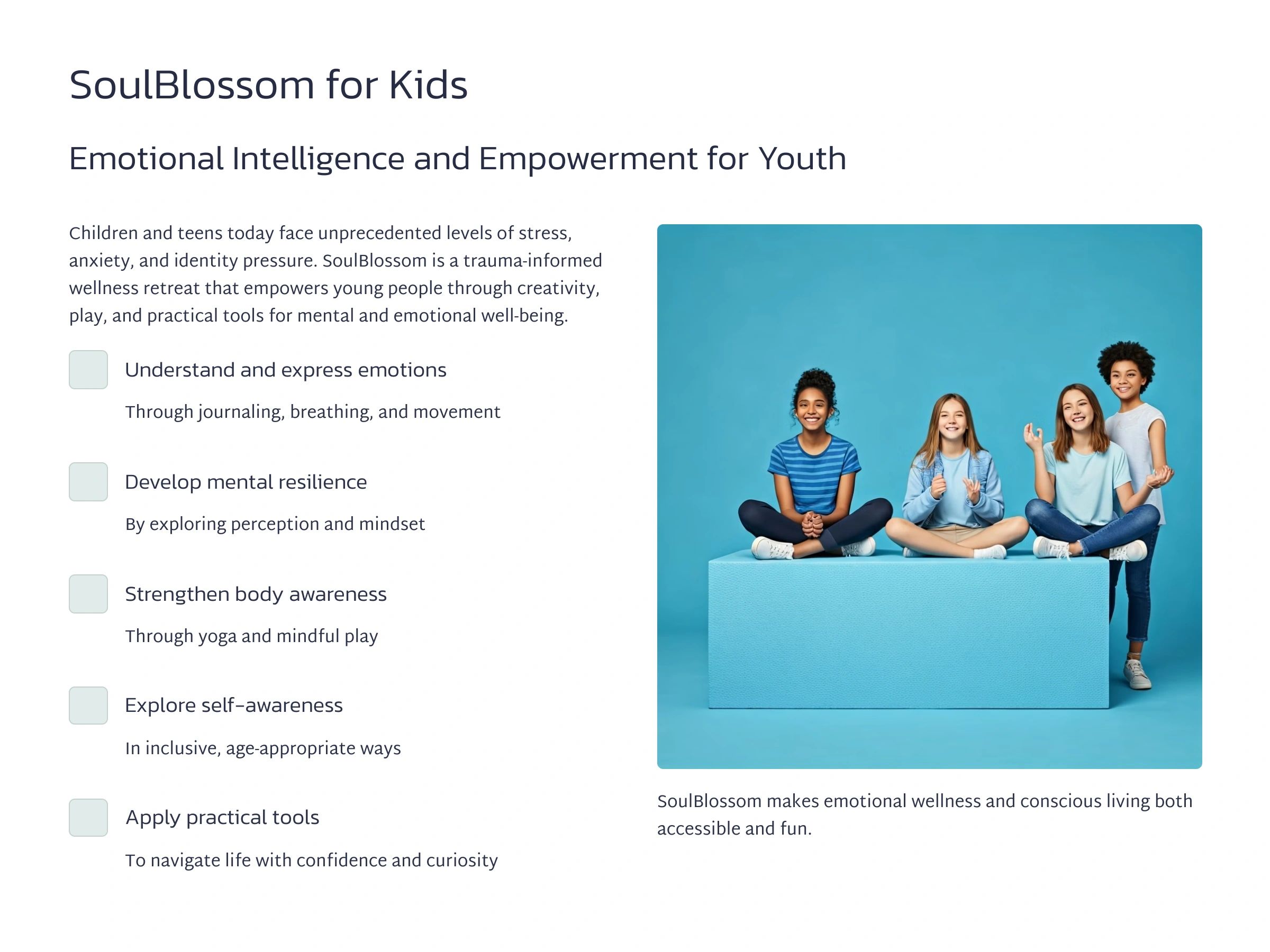 Through immersive workshops, retreats, and online courses like SoulBloom, SoulBlossom for Kids, and SoulTech AI, the Academy is cultivating a new generation of mindful leaders, resilient families, and awakened communities. Whether you're navigating change, seeking deeper meaning, or preparing for a future shaped by technology, SoulTech Academy provides the tools to rise—body, mind, and spirit.