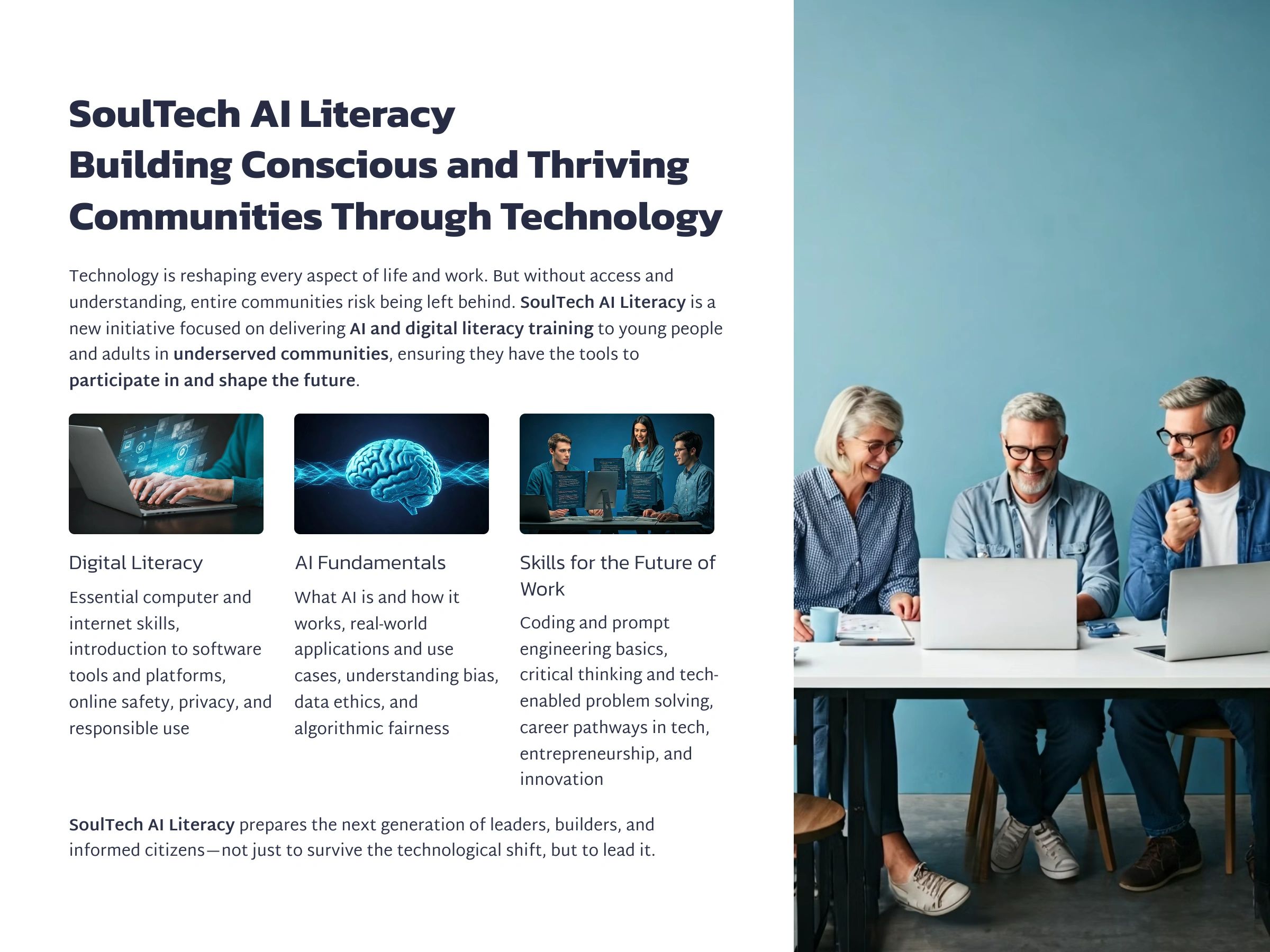 We are committed to providing underserved communities with transformational education that fosters emotional resilience, spiritual growth, and technical skills. Our goal is to ensure both adults and children have the tools to thrive in the modern world.